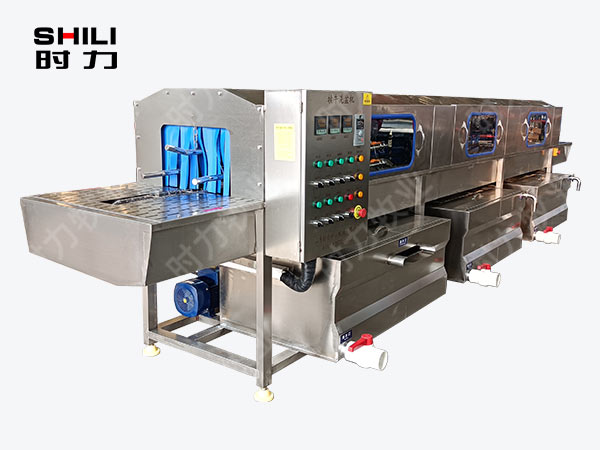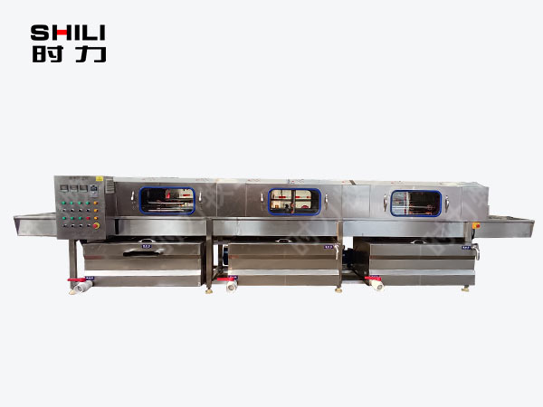 整機采用四面噴淋,三段清洗,第一段為熱堿水,第二段為熱清水,第三段為自來清水,熱水箱兩段內分別設有電加熱管道;帶有溫度控制裝置,溫度從常溫至90°C自由設定。各個循環(huán)水箱均采用臥式加立式不銹鋼離心水泵循環(huán)噴淋,從上、下、左、右,四個方向同時對產品進行噴淋沖洗;需清洗的產品由不銹鋼鏈條輸入清洗機中,依次通過人工上桶→ 自動除渣→高壓主洗→高溫預漂洗→高溫清水漂洗連續(xù)式清洗;每個水箱均設有過濾網(wǎng)裝置,便于隨時清理。