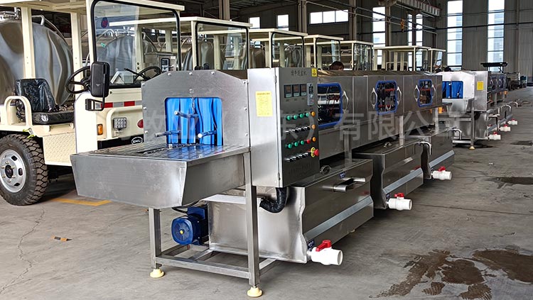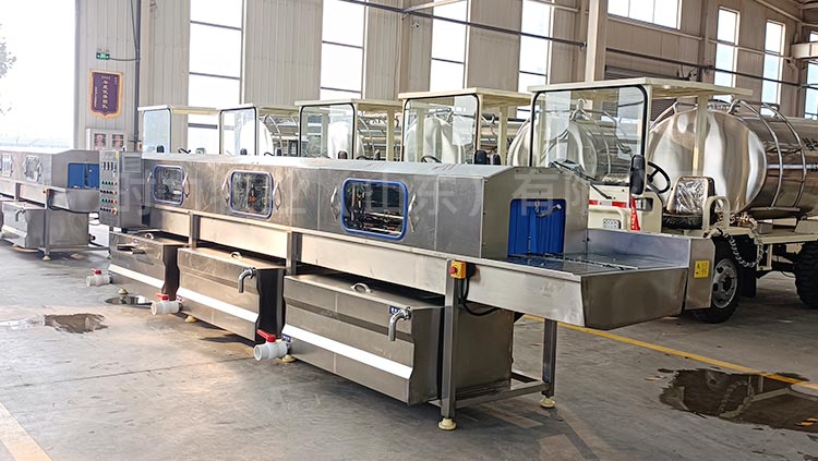和國內多個大型牧場建立合作關系,整機設備采用折彎式水箱,水箱內部加裝過濾網(wǎng),自動補水,水箱上端加蓋子節(jié)約能源,內部采用電加熱,水位可控,電加熱自動保護,變頻調速電機,根據(jù)現(xiàn)場實際情況進行速度的調節(jié),可控溫,調溫,所有水泵均采用不銹鋼泵頭,水泵進口處加裝二次過濾,內部所有噴淋管全部是快拆式結構,防止噴淋管阻塞,噴頭可以360度調節(jié),雙卡扣,每道清洗處均采用軟簾連接,防止串水,整機采用sus304不銹鋼制造。